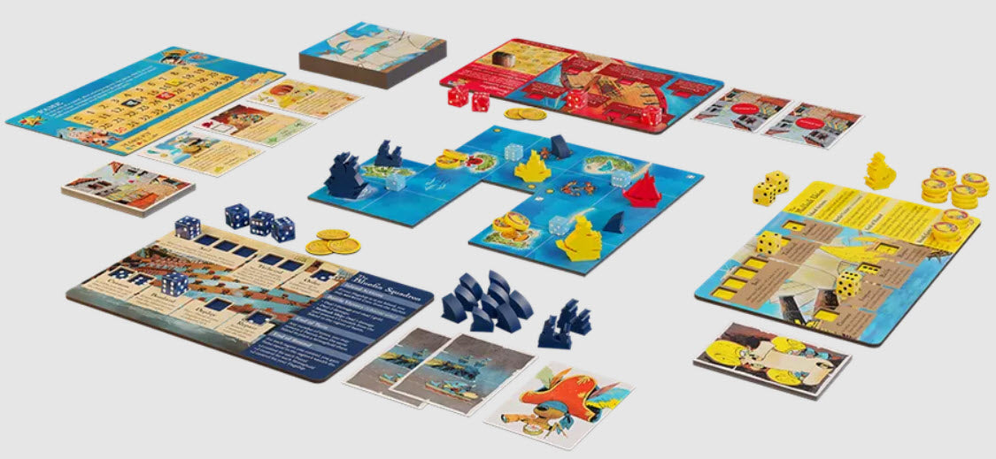 You are swashbucklers and soldiers on the high seas. Each round, you’ll roll and place dice to take the unique actions of your faction. As you control regions and deliver cargo, you’ll gain Fame. The player with the most Fame wins!