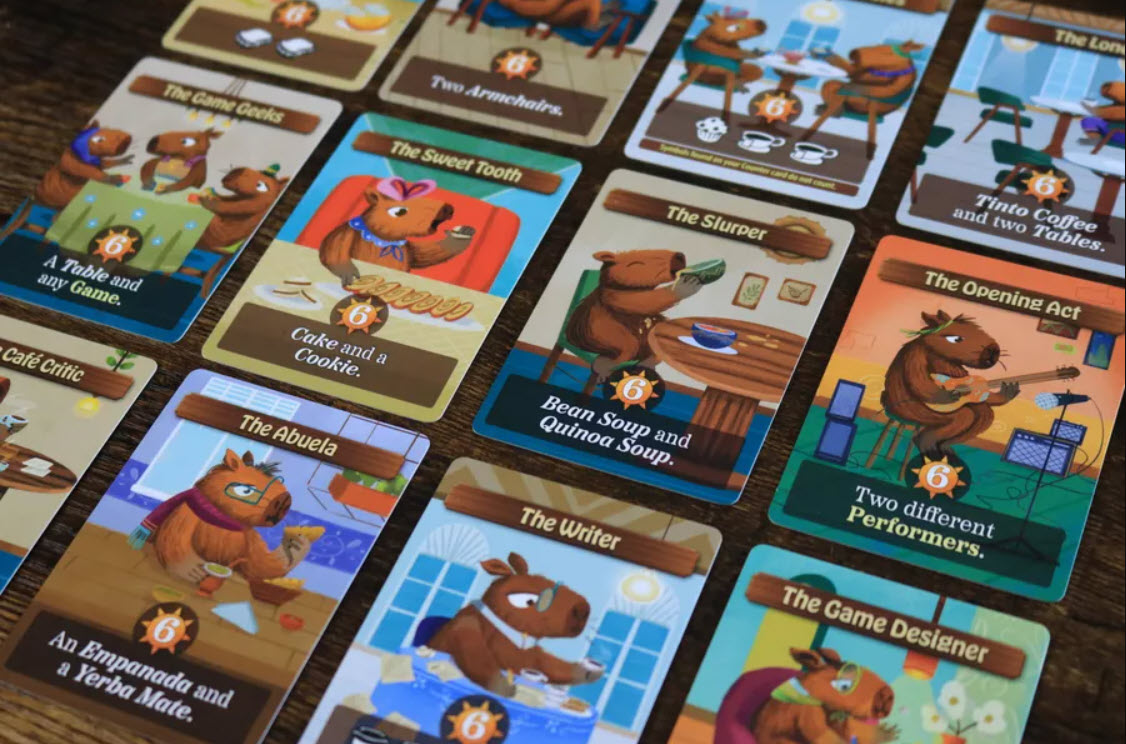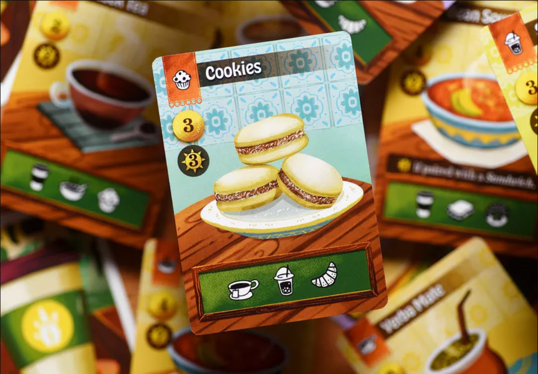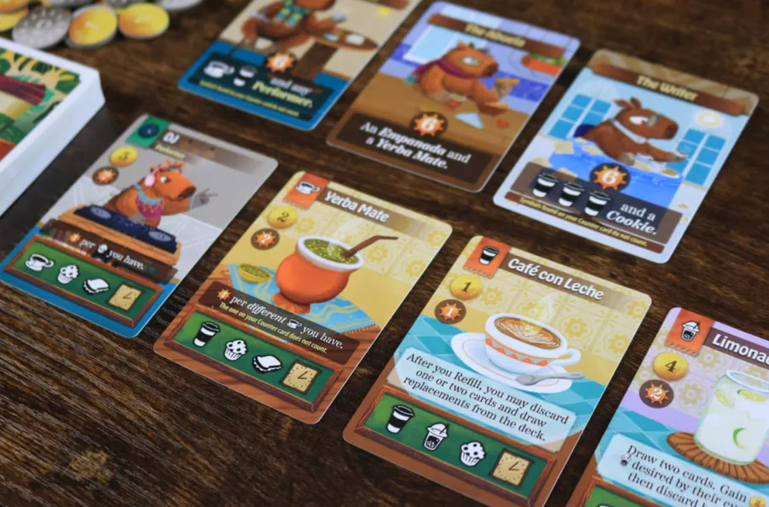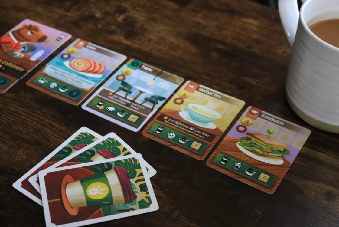 Each turn, you play a card from your hand, either buying it as a food, drink, or decor item for your café or serving the customer on the card and earning money. If you meet a customer’s needs completely, they become a Regular and earn you extra end game points!