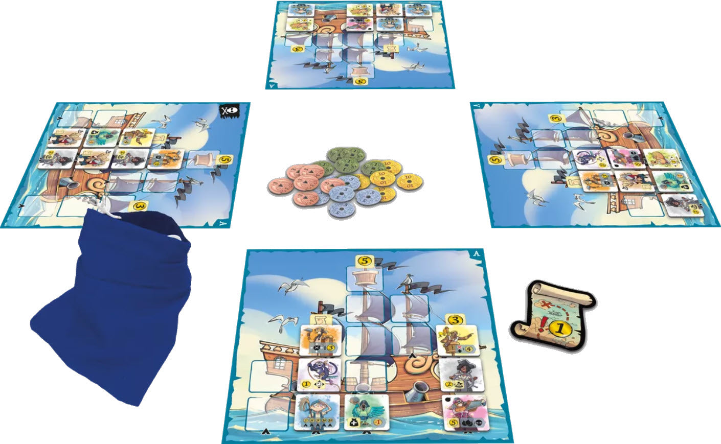 Ahoy, Captain! Hoist your flag, recruit a crew, and fill your coffers with shiny, gold coins. Captain Flip is a game of obvious simplicity explained in less time than a cannonball shot. On your turn, draw a tile from the bag. You like it? Keep it! You don't like it? Flip it! Then place it on your board to form your crew. With its nine characters and four boards with different tactics, Captain Flip offers an immediate, fun, and subtle gaming