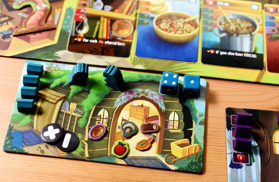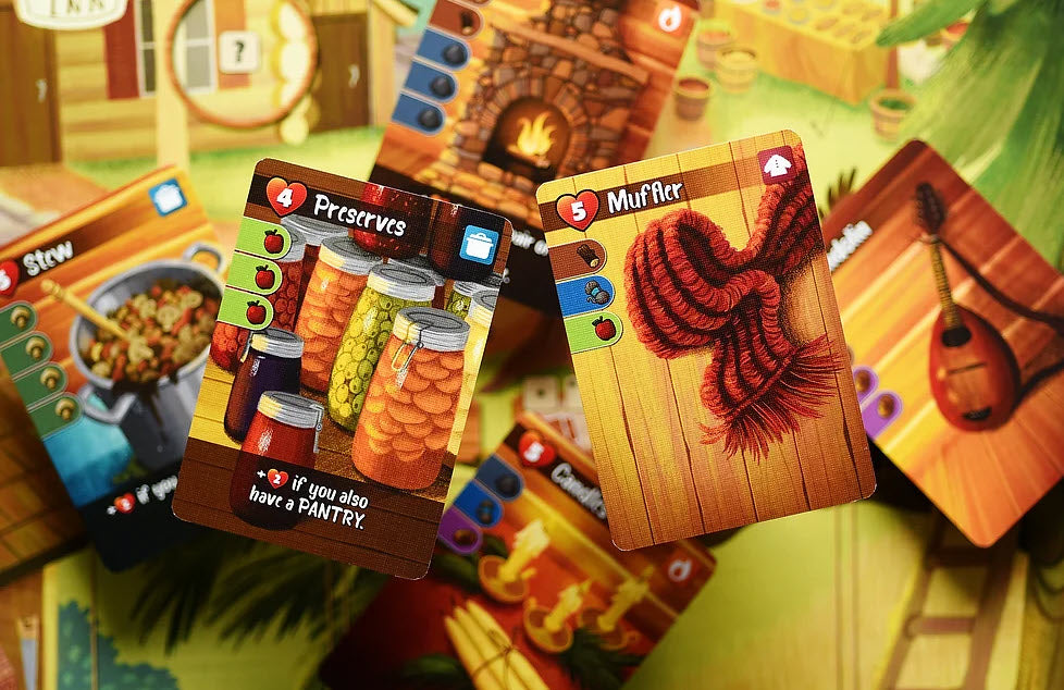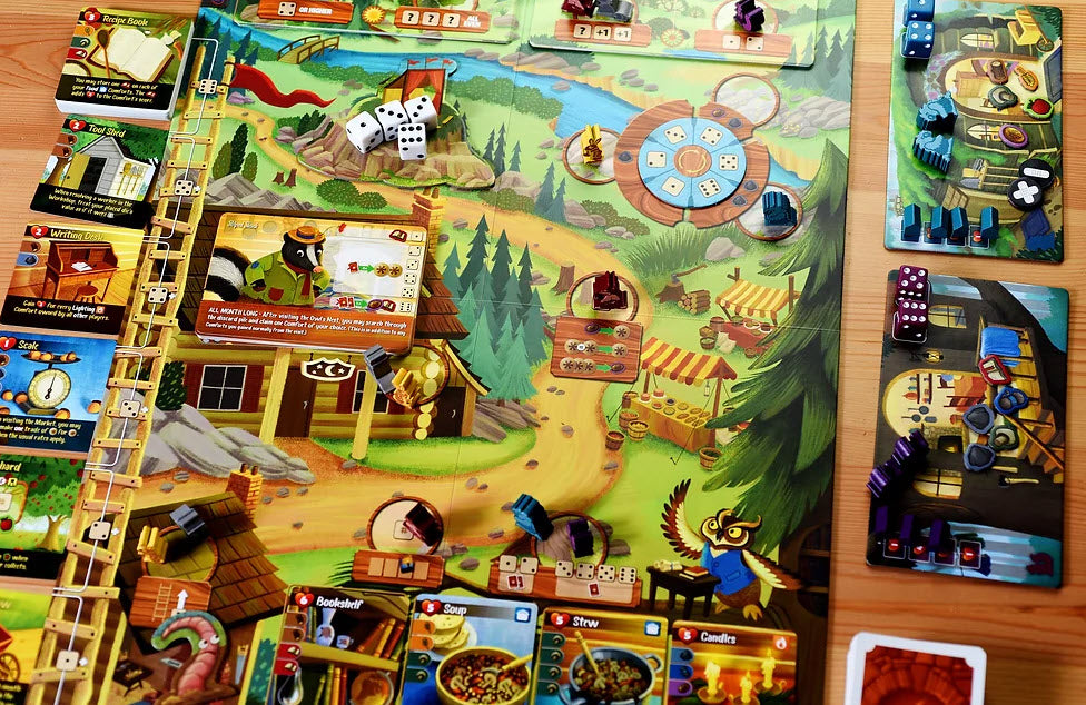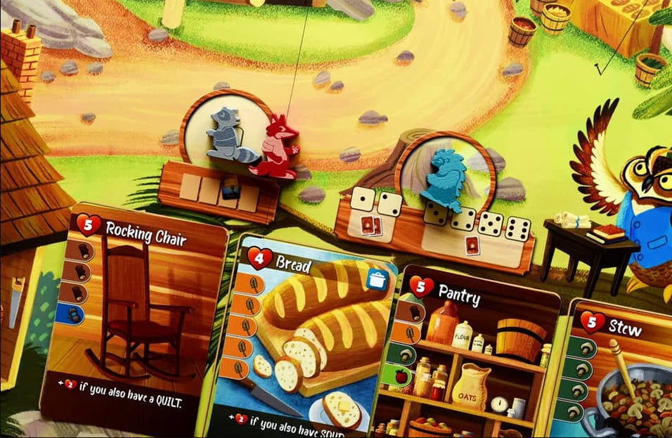 In Creature Comforts, you spend the Spring, Summer, and Fall gathering different goods from the forest and spending them to collect items that will make your home more inviting while the world outside is covered in a layer of snow. Each round you send family members out to various locations in an attempt to gain supplies. If they fall short of their goal, they’ll learn a lesson and be better prepared next time. The family that has created the most comfortable den wins the game.