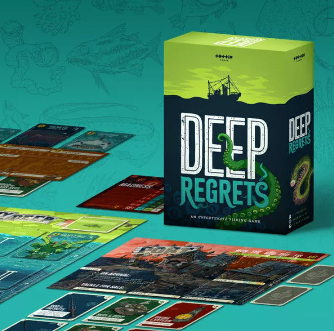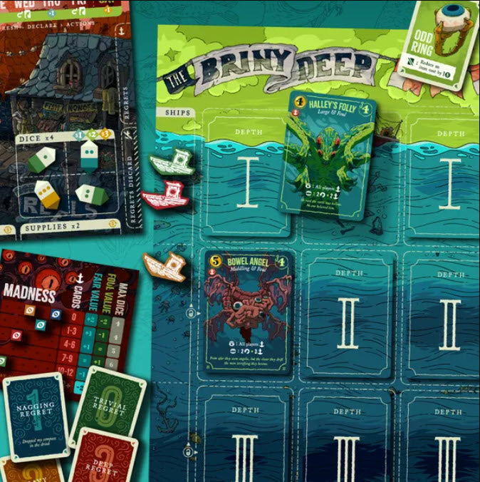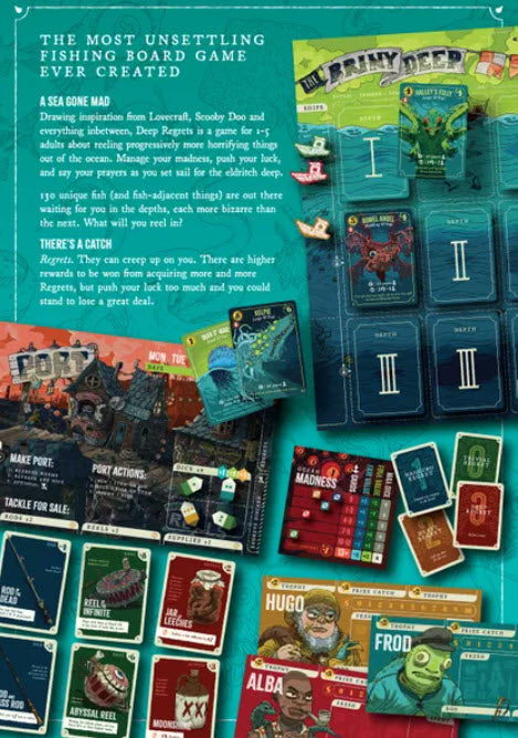Survey the sizes of shadows on the backs of 9 different fish shoals at three depths, determining what you think you can afford to catch and if you want to risk it for a potentially better reward. Flip fish, spend dice, add them to your collection - but beware of reveal and catch abilities that can have various effects on the game! As your eyes spy more and more horrifying things, you'll collect Regrets cards - which drive up your madness but also give you access to more dice and increase the value of weirder fish. It's a risk/reward scenario as you balance your madness, knowing that at the end of the game the player with the highest value of Regrets will have to discard their most valuable mounted fish.