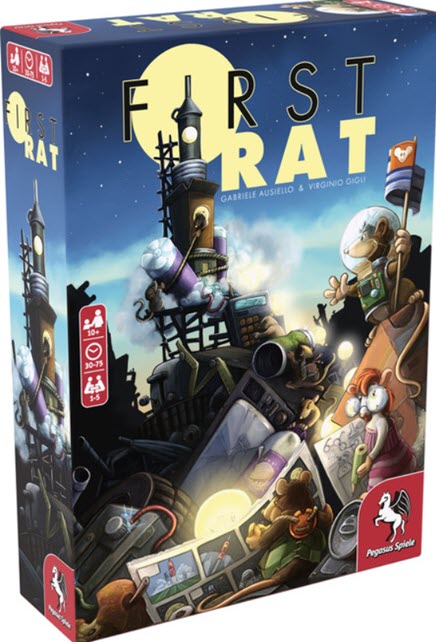 First Rat is a connoisseur's game for up to five people, which can also be played solo. Numerous strategies, special abilities and a variable structure make every game exciting. In each turn, the players must decide whether they prefer to move a rat up to five squares or instead let several rats run up to three squares - the rats may only end their movement on squares of the same color. And if there are already rats from the competition, it also costs one cheese per foreign rat! Along the way, the players collect resources, acquire (or steal) useful items, build rocket parts or train Rattonauts in order to get as many victory points as possible.