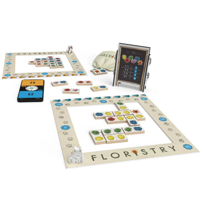 Floristry is a 2 player, tile-laying game. Players compete at the historic Aalsmeer Dutch Auction to win the best flowers and then use them to create the most charming window display.