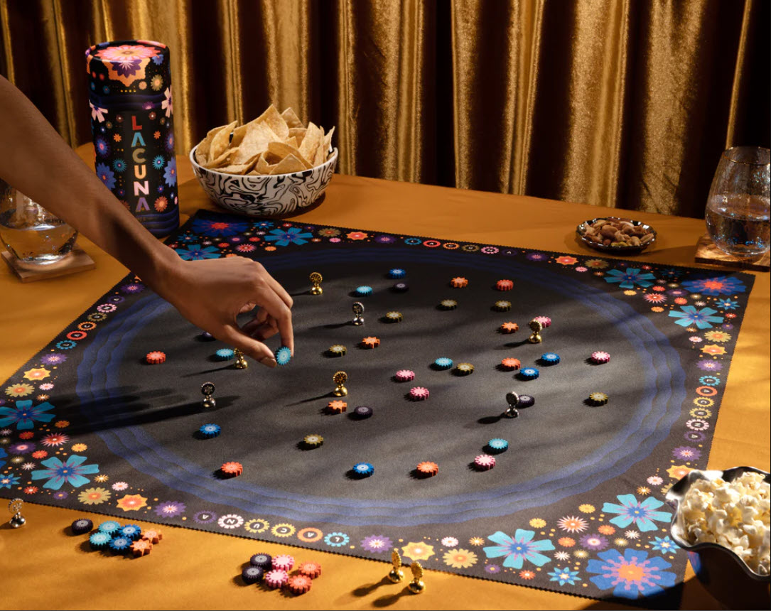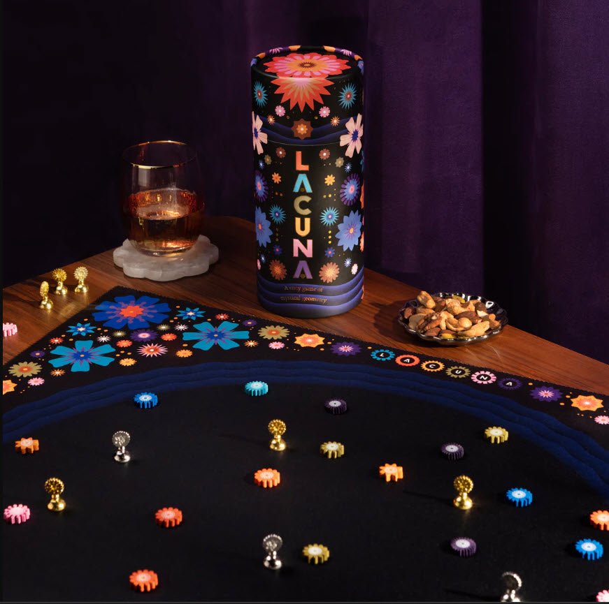 Lacuna is a game for 2 players about collecting flowers on a pond at night. Draw an imaginary line between two flowers, place your pawn, and collect both flowers. Win by collecting the most flowers in the most colours!