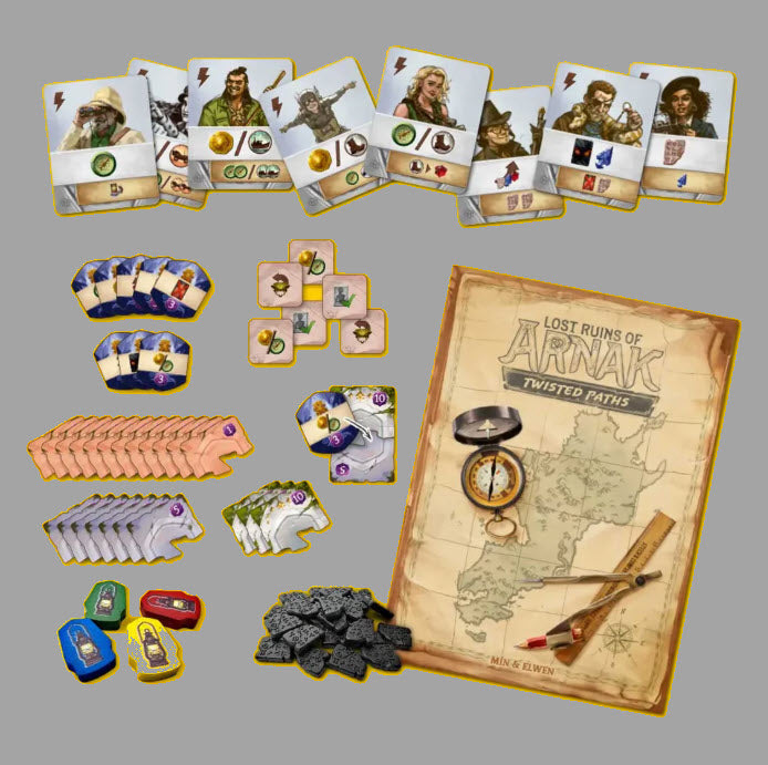Inside the Adventure Chest is a fresh addition to the world of Arnak: the new expansion Twisted Paths. This expansion brings a new double-sided map bigger than the one in the base game and includes two new research tracks, each with unique mechanisms and components (like brand new temple tiles or new resources—dark tablets).