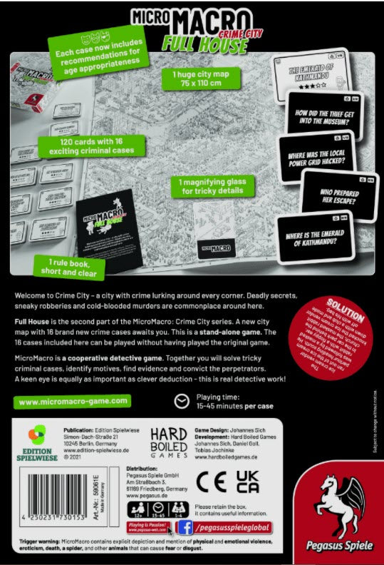 MicroMacro: Crime City – Full House includes 16 cases for you to solve. Each case includes a number of cards that ask you to find something on the map or uncover where someone has gone or otherwise reveal information relevant to a case. You'll need to piece together what happened, whether by going through the case card by card or by reading only the starting card in the case and trying to figure out everything that happened for yourself. Will you be able to answer all questions about the case without fail? Some cases will also be marked with a series of symbols indicating which ones are more suitable for younger players, widening the games appeal even further in this much-anticipated sequel.