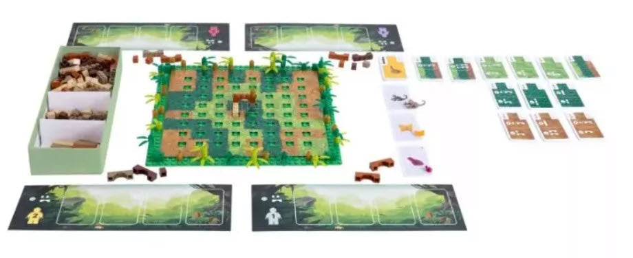 1 LEGO® plate 32×32, 231 LEGO® bricks, 67 Monkey Cards, 14 Bonus Cards, 3 Trophy Cards, 4 Player Boards, 2 Ground Maps with maps on both sides, 1 Brick Tray, 1 Rule Book.