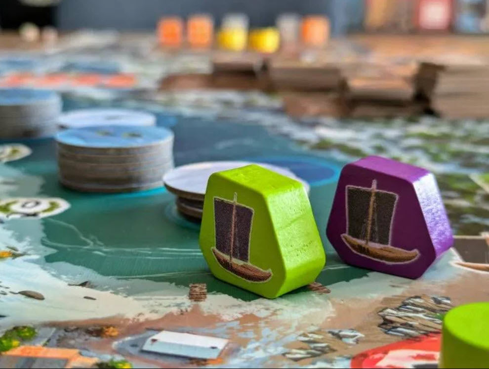 Over three rounds, players draft dice to activate buildings in their settlement. This provides resources as well as activating actions such as sending out your fishing boat, advancing along the various technology tracks, completing trade orders, or erecting new buildings. Each player's player board shows a grid. When you draft a die, you activate all buildings in the row or column corresponding to that die. By erecting buildings in your settlement, each die can activate more buildings.