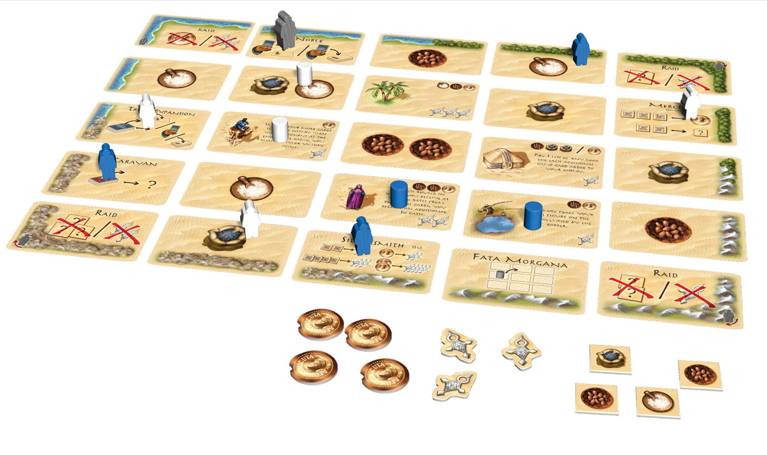 In the game, the desert is a five-by-five grid of cards. Position your Targi figures on the cards that border the desert. You carry out the actions of those cards as well as the cards at the crossroads between them. If you don’t go to the merchant, you won’t be able to trade — and even worse, your opponent will. Or maybe a caravan will bring the merchandise you desire. There are many choices to consider. But don’t wait too long, the desert is harsh and you might miss an opportunity to make a deal.