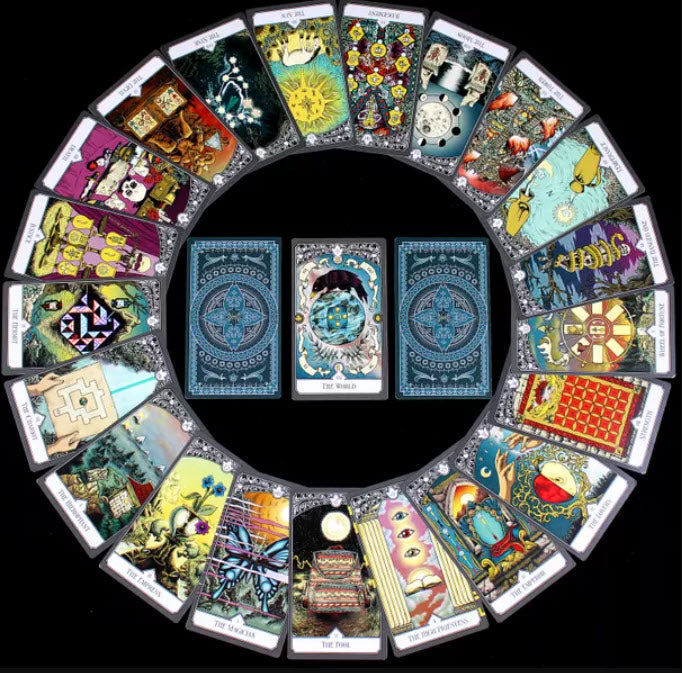 The tarot deck contains 78 cards--56 Minor Arcana and 22 Major Arcana, the latter of which each represent a puzzle. Puzzles are solved using sets of Minor Arcana cards and clues from the story booklet and result in solution keywords that lead players to discover new pieces of the narrative. Some story passages grant items which can be later used to unlock extra scenes, and some puzzles have multiple answers, allowing players to unlock more of the story if they find all the solutions.