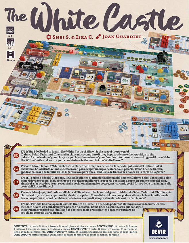 In The White Castle, players control one of these clans and want to score more points than the rest. To do so, they must amass influence in the court, manage resources boldly, and place their workers in the right place at the right time. All of the action takes place in the most imposing fortress in modern Japan: Himeji Castle, where the banner of the Sakai clan flies under the orders of Daimio Sakai Tadakiyo.