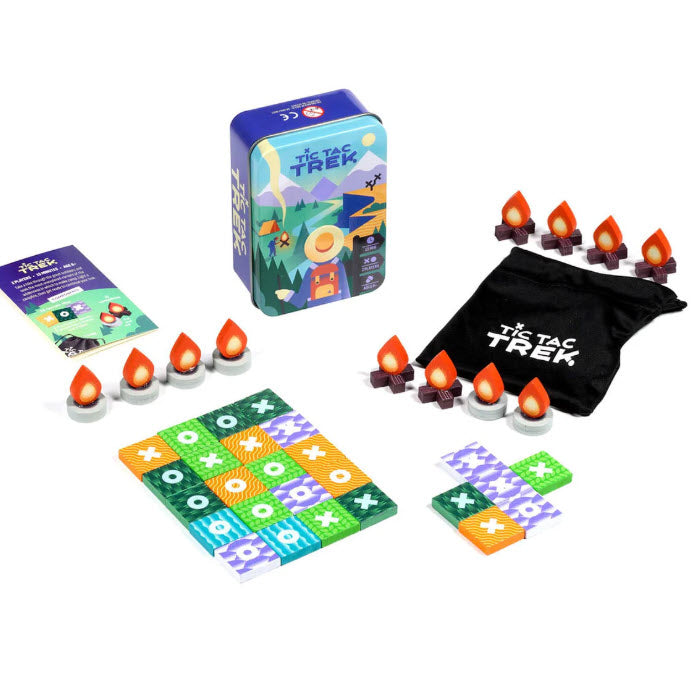 Tic Tac Trek is a light strategy game for 2 players. Players take turns drafting tiles from a bag to place in the shared play area. If the tile placed forms 3 in a row, the player can place one of their campfire tokens in the tile just played. Play continues until all tiles have been placed from the bag. Players will then score their campfire tokens that are in the play area. Each empty space surrounding the campfire scores 1 point. The player with the most points wins.