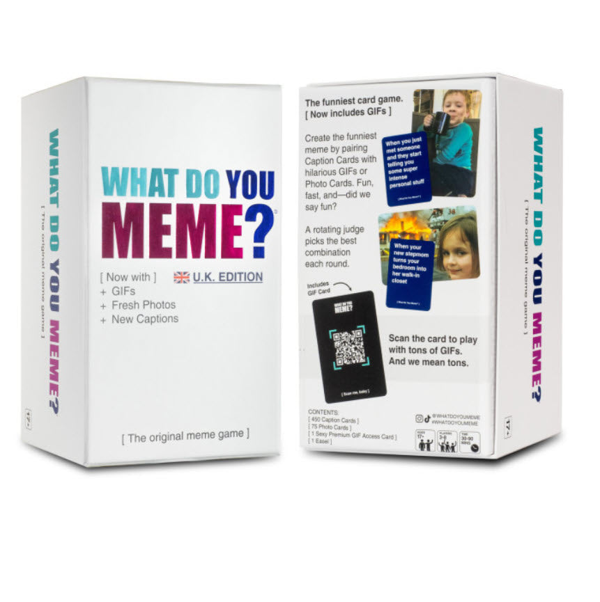 - What’s Inside: Each What Do You Meme Refreshed UK Edition 1 Premium GIF card to Scan, 450 caption cards and 75 new photo cards. Printed on premium playing cards (thick with gloss finish); includes an easel and bonus rules, shrink-wrapped in a custom box.